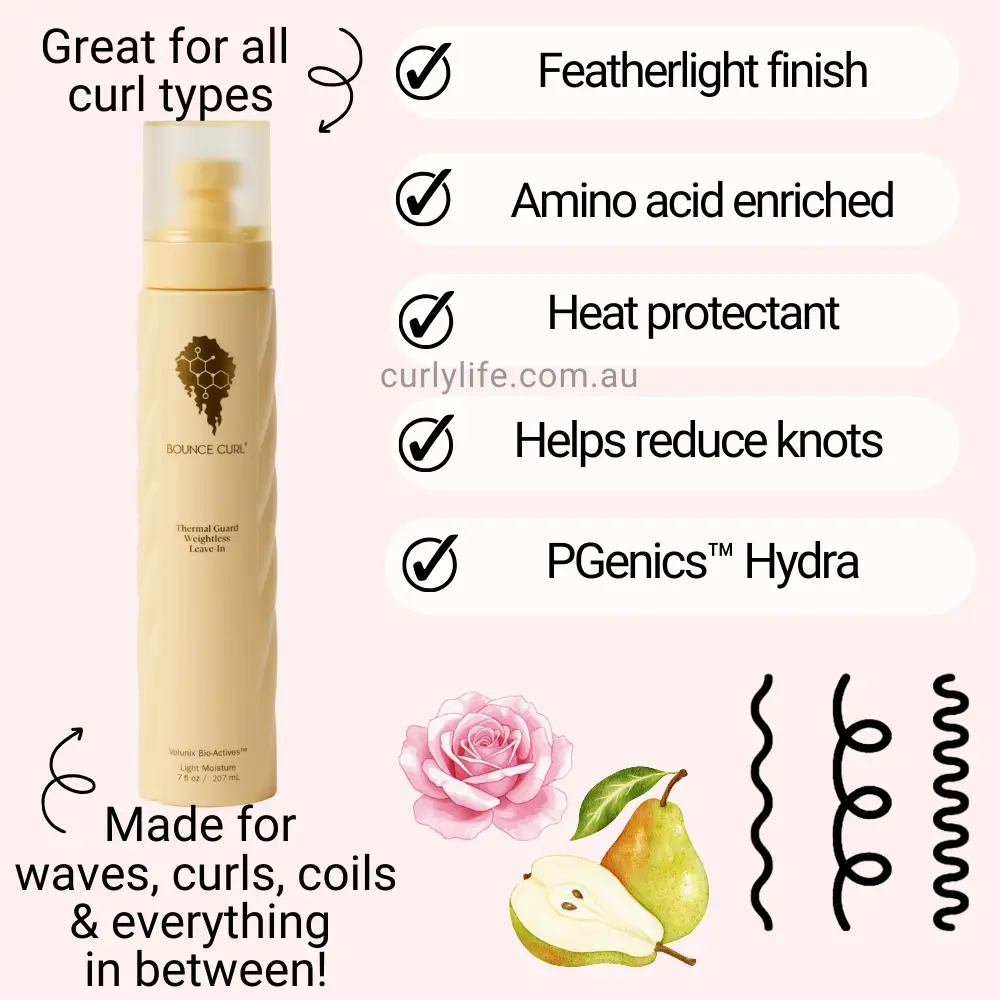 Apply to wet hair: After washing and conditioning, section hair and mist Bounce Curl Thermal Guard Weightless Leave-In evenly from roots to ends.