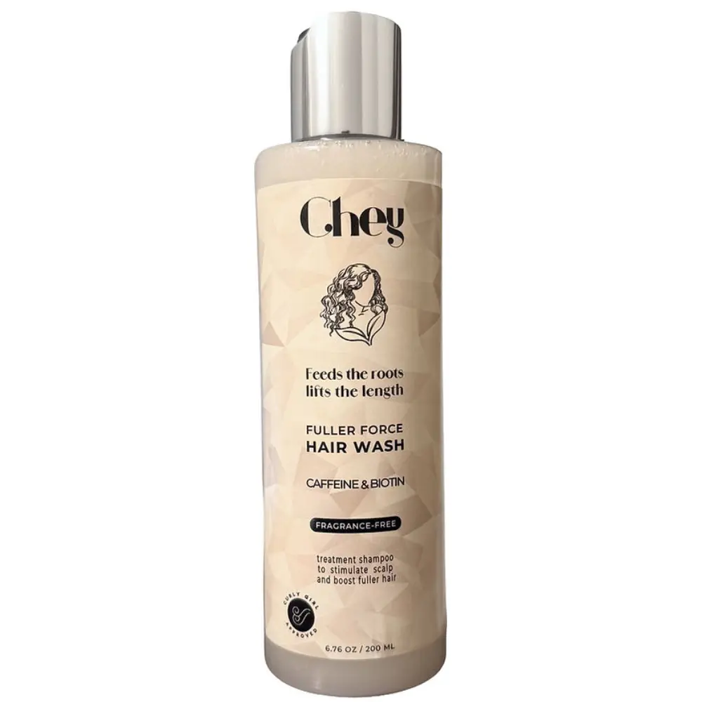 Chey Hair Care Fuller Force Hair Wash leaves your hair stronger, thicker, and full of life. Plus, the hyaluronic acid keeps your scalp perfectly hydrated and balanced.