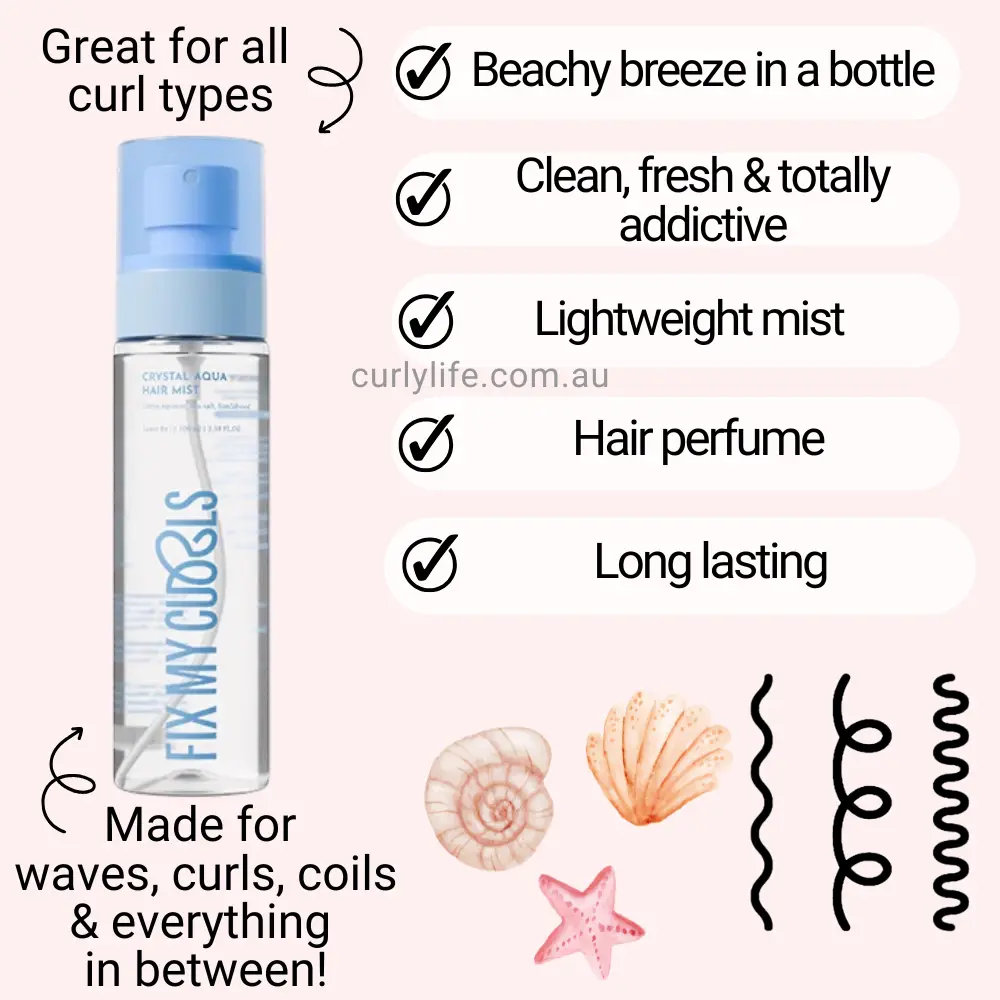 Your hair’s passport to paradise. One spritz, and you’re breezy, beachy, and instantly refreshed. Whether you’re oceanside or just dreaming of it, this clean, crisp mist leaves your hair smelling like a sea-soaked daydream. Fix My Curls Crystal Aqua is the perfect for fragrance lovers who want fresh vibes, minus the fuss.