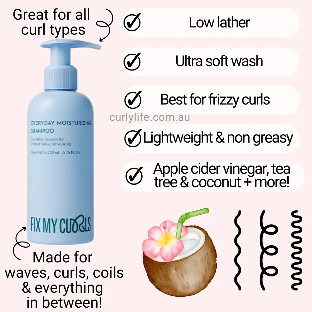 Say hello to your mid-week refresh. This creamy, low-lathering shampoo is made for dry, frizzy, or damaged curls that need a little extra TLC. Fix My Curls Everyday Moisturizing Shampoo gently cleans your scalp while adding shine and smoothness. We’d say it’s a magical two-in-one dream!