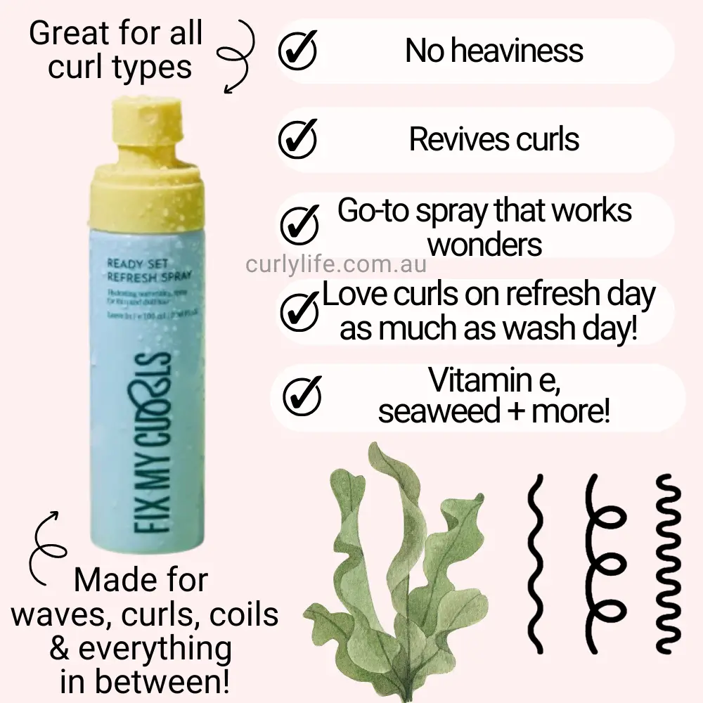 Need a quick refresh? Meet our ultimate low-maintenance hair hero! Fix My Curls Ready, Set, Refresh Spray is a water-based, lightweight mist designed to bring volume, softness, and shine to your waves. Packed with frizz-fighting power and light definition, it’s the weightless solution your hair’s been waiting for.