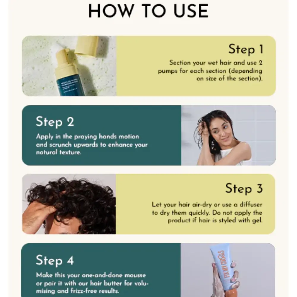Step 3: Let your hair air-dry or use a diffuser to dry them quickly. Do not apply the product if hair is styled with gel. Make this your one-and-done mousses hair or pair it with our hair butter for volumising and frizz-free results.