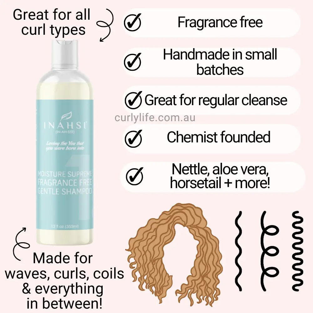 This Ultra moisturizing Inahsi Naturals Moisture Supreme Gentle Shampoo moisturizes as it cleans. Our shampoo will clean your hair and scalp without stripping it of its natural nutrients. This moisturizing shampoo will melt tangles on contact. The nettle and horsetail provide shine and bounce to your curls while stimulating the scalp to promote overall healthy hair.