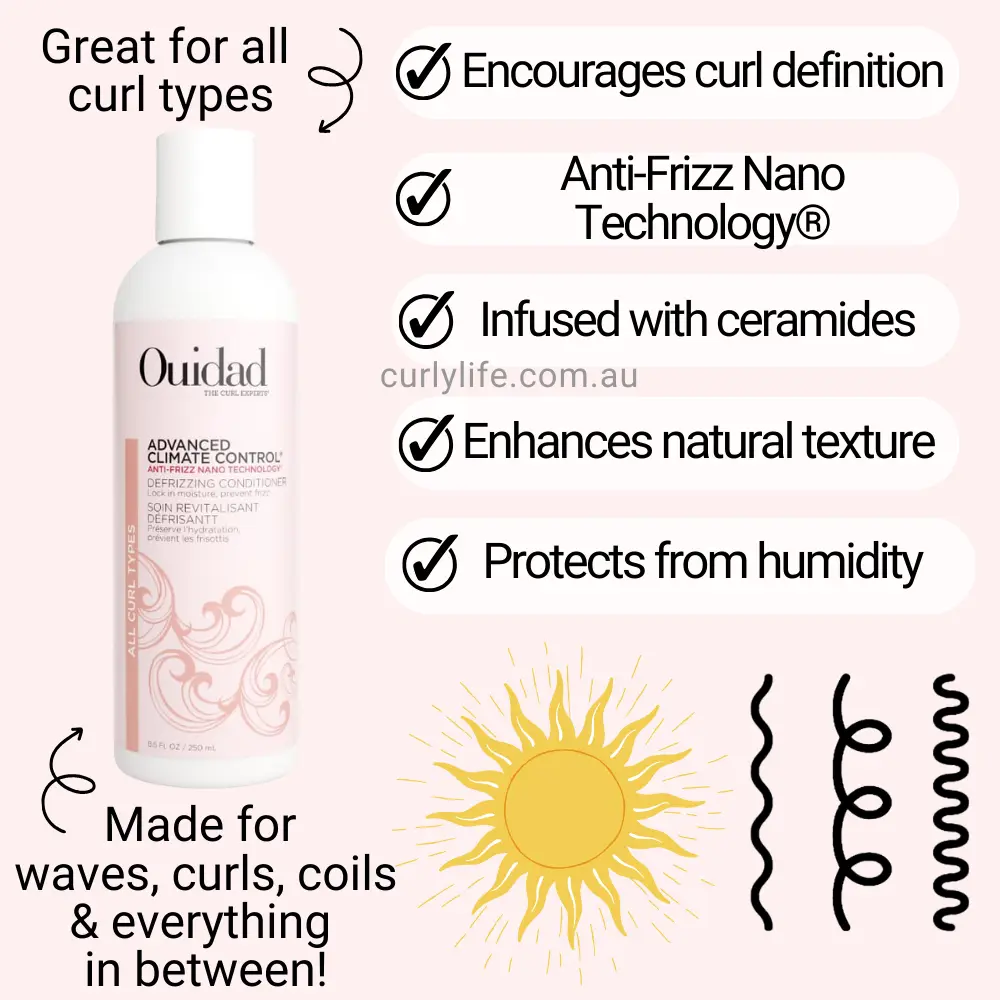 For best results, use after cleansing with Ouidad Advanced Climate Control® Defrizzing Shampoo. Style curls with Advanced Climate Control® Detangling Heat Spray and Advanced Climate Control® Heat & Humidity Gel for lasting frizz protection.