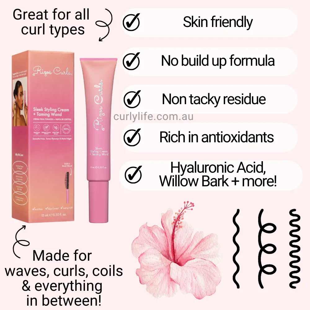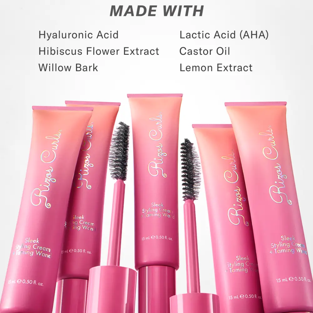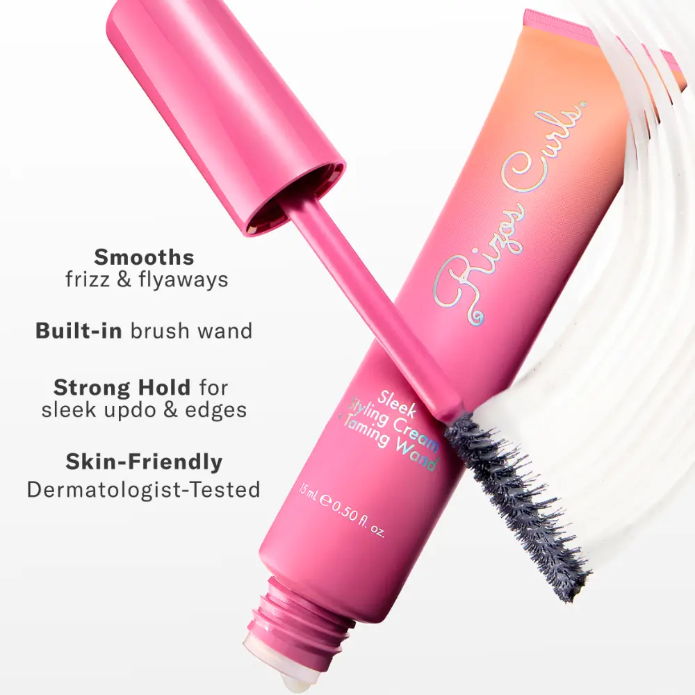 Glide the dual sided brush wand across stray strands for flyaway & frizz control. Rizos Curls Sleek Styling Cream + Taming Wand can be used to style edges, smooth baby hairs and create sleek updos.