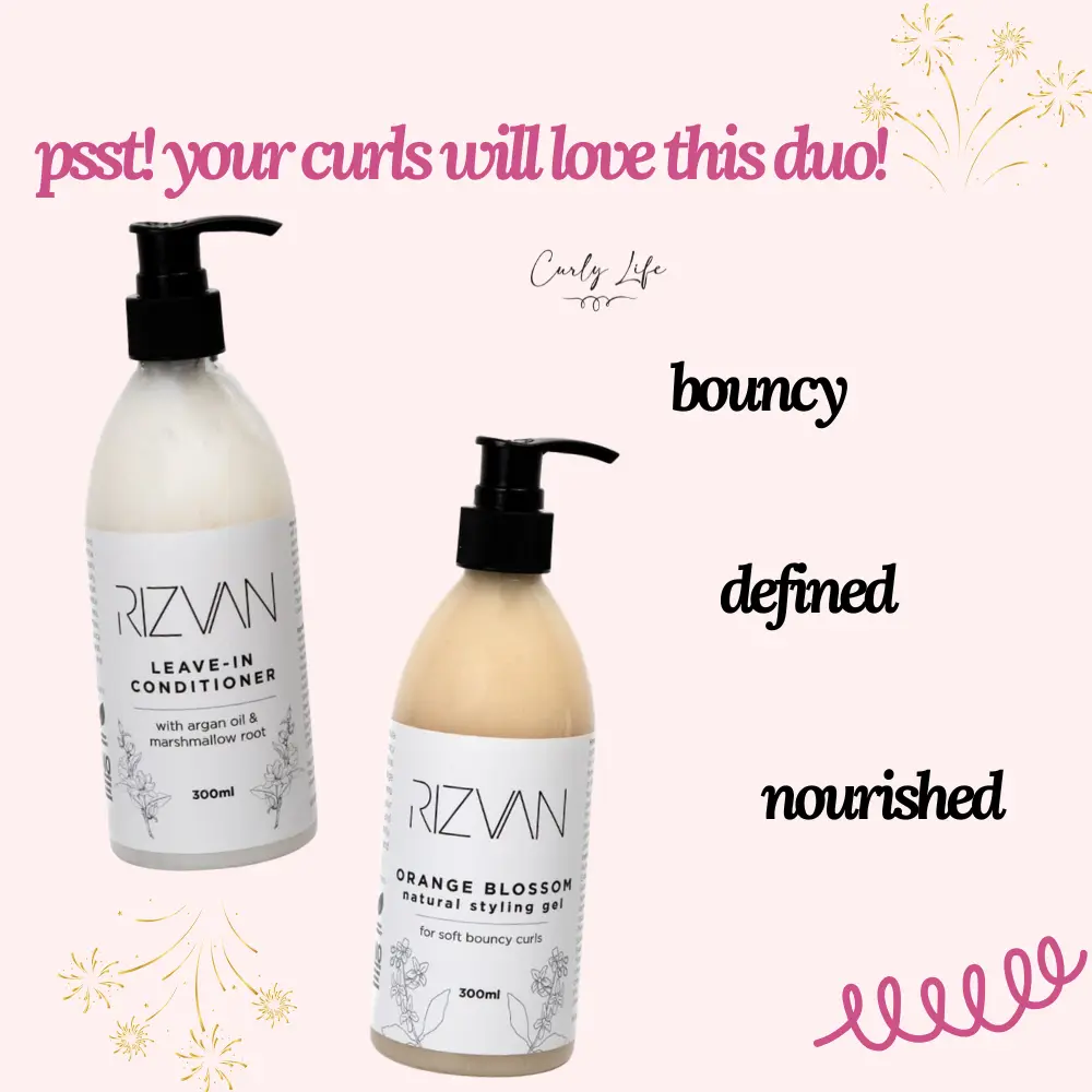 After washing your hair, while it is still soaking wet, section off hair into 3-5 sections depending on your length. Work the leave-in into each section by working up to the roots from the ends. Smooth Rizvan Leave-In Conditioner into your curls. Take time to distribute the product well and coat each section of hair equally with the product. Scrunch and follow with Rizvan’s Orange Blossom Natural Styling Gel or Rose Curling Custard.