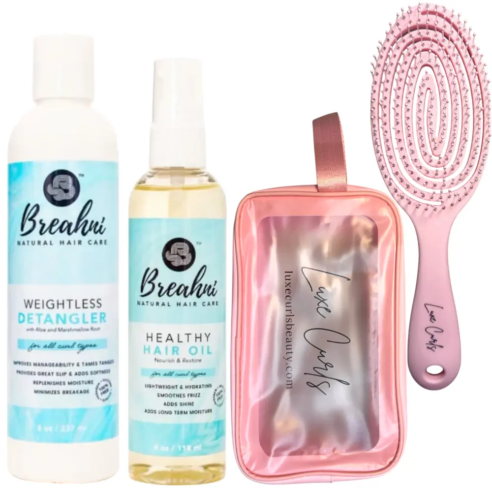 This detangling themed kit is designed to help curly girls at any stage in their journey. Use the oil as a pre-wash to soften your curls. Allow it to soak on dry hair for 10 minutes before getting into the shower. This preps your curls for detangling. Once cleansed and conditioned, use the detangler and anti breakage wet brush to gently detangle your knots, starting from ends to tips. Store all your new detangling heroes in your new cosmetic bag.